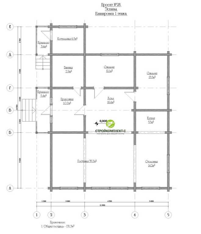 Дерево во все времена являлось приоритетным материалом при возведении экологически чистых построек. Неоспоримые достоинства натуральной древесины, использование передовых технологий и традиций обеспечивают возможность создания уникальных деревянных построек, притягивающих взгляд потрясающим дизайном. Дома из профилированного бруса практичностью, современным и стильным видом, надежностью и долговечностью. Для их сооружения не нужен мощный фундамент, не требуется внешняя и внутренняя отделка, и возводятся они в короткие сроки. Проект одноэтажного дома из профилированного бруса ПБ 30 очаровывает величием, уникальностью и красотой. Постройка имеет один этаж, где расположены все необходимые помещения для комфортного проживания. Через большие стильные и оригинально исполненные окна во все помещения дома проникает много яркого солнечного света, дарящего тепло и отличное настроение своим обитателям. С небольшого крыльца на открытой террасе имеется вход в уютную прихожую и просторный холл. В левом крыле дома имеется ванная и две спальные комнаты. Справа от холла расположена огромная светлая гостиная, столовая и кухня, объединены в единое пространство. В котельную предусмотрен отдельный вход.