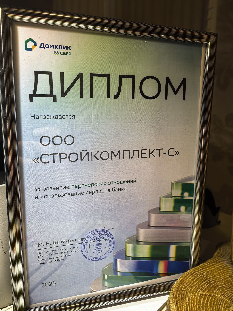 Награда от Среднерусского банка ПАО «СБЕРБАНК» за развитие партнёрских отношений и использование сервисов банка